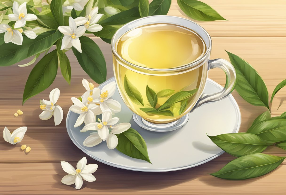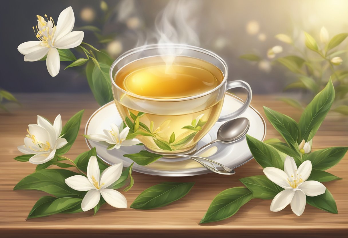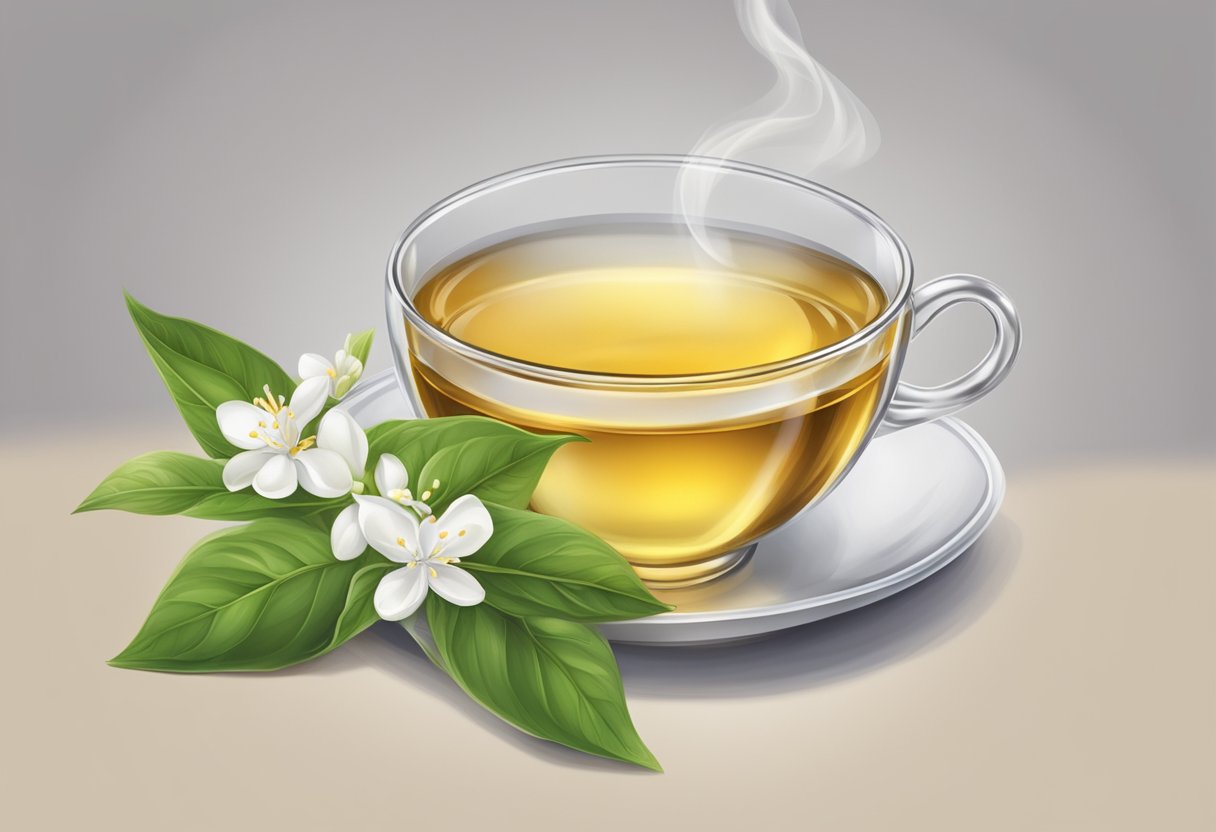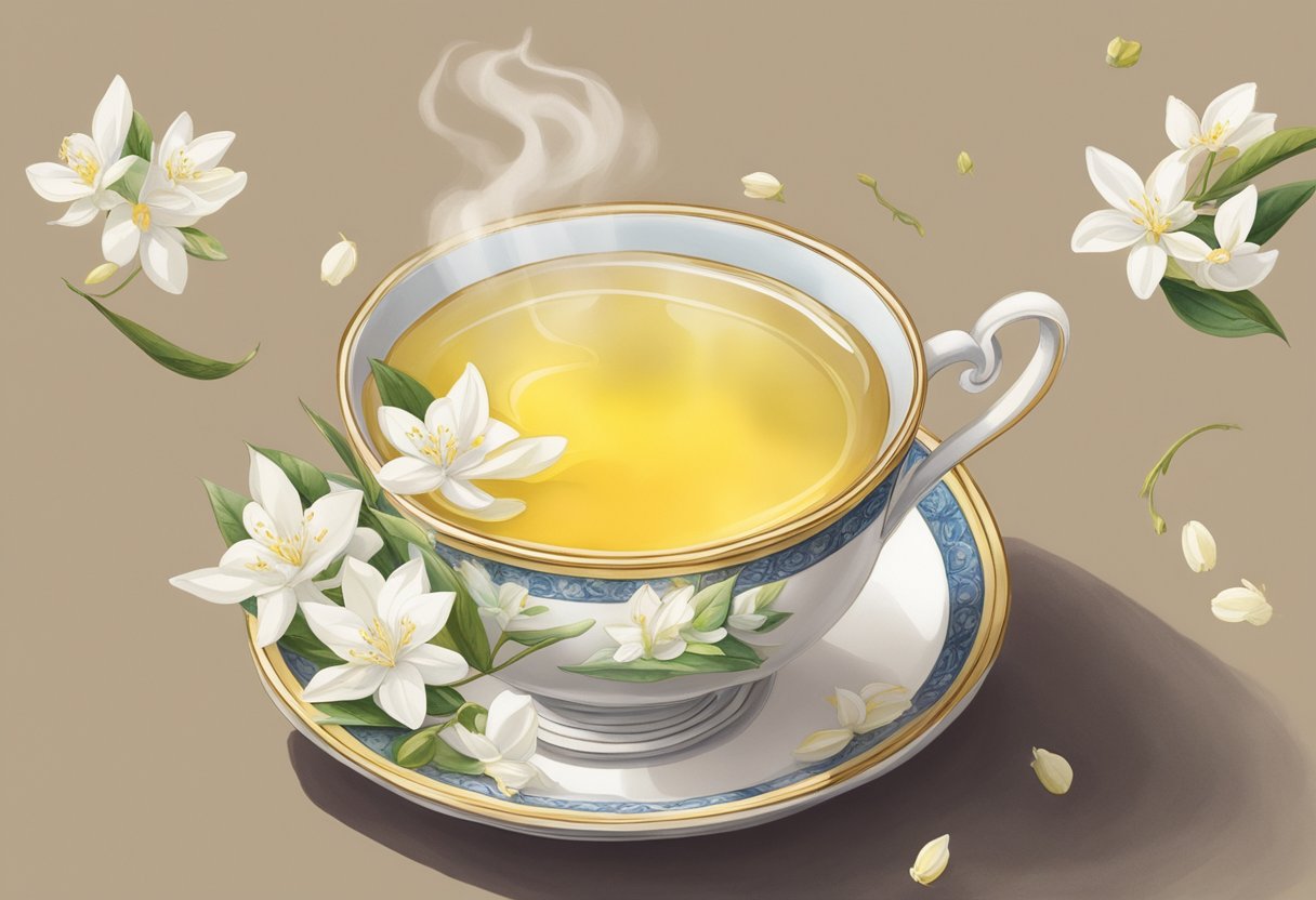 Jasmine tea offers a unique sensory experience deeply rooted in both taste and tradition. Your palate meets an exquisite balance of flavors when you sip on this fragrant beverage—it’s a harmonious blend of green, black, or white tea leaves and the captivating aroma of jasmine blossoms. Typically, jasmine green tea is the most common variety you’ll find, using green tea as the tea base, which provides a lighter and more delicate canvas for the jasmine’s floral notes to shine.